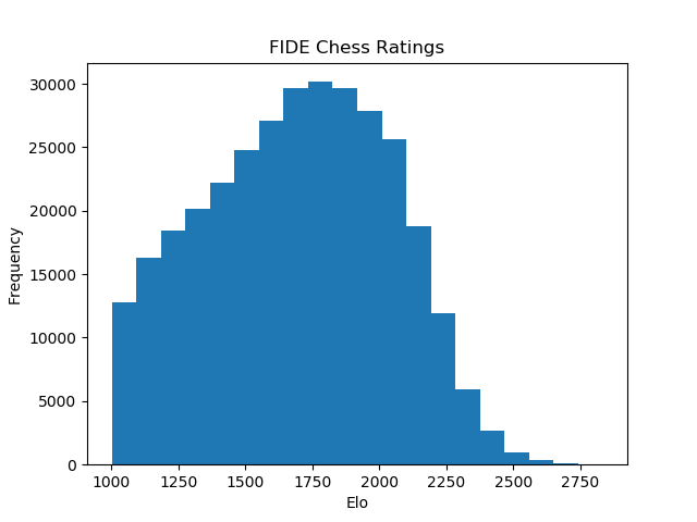 To test this, I went to FIDE, who helpfully have a public database of all professional chess player's Elo ratings. Although FIDE puts a hard floor on all rankings, using numpy we can create a randomized distribution that roughly mimics the actual score distribution. These will be our players' true scores.