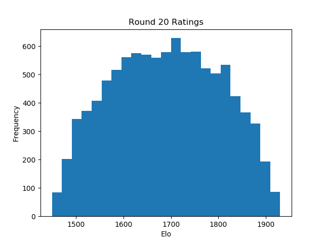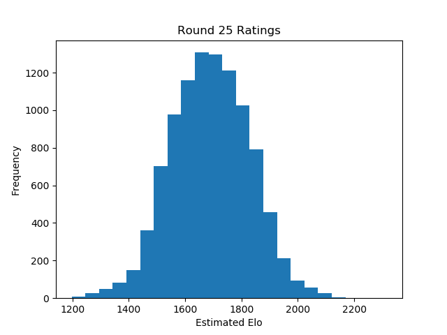 We quickly see our distribution tighten to match a Guassian approximation of the actual of FIDE ratings.