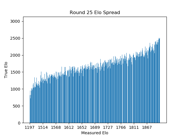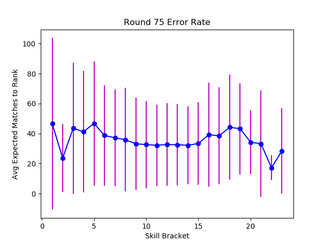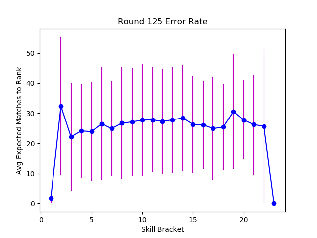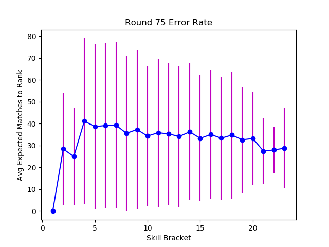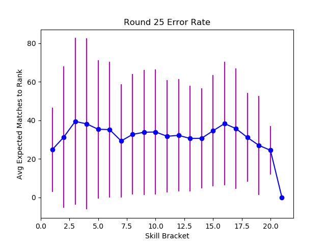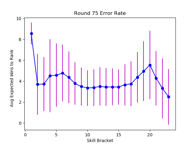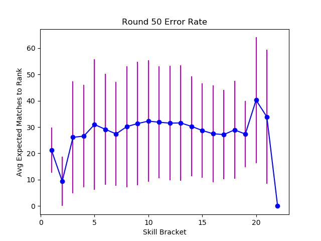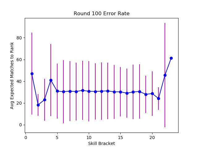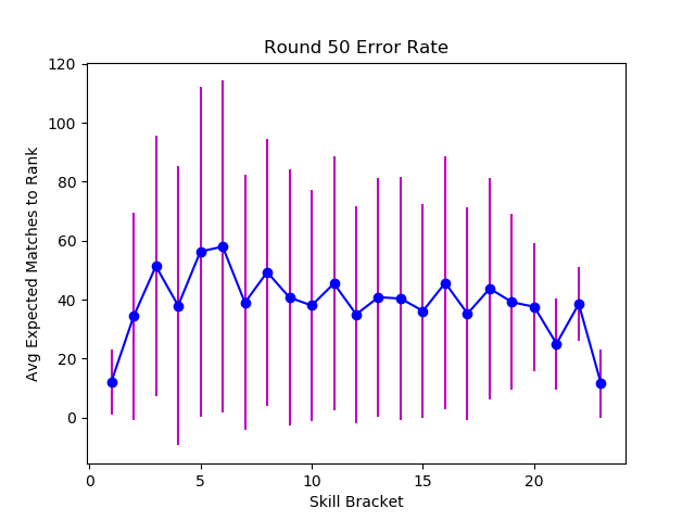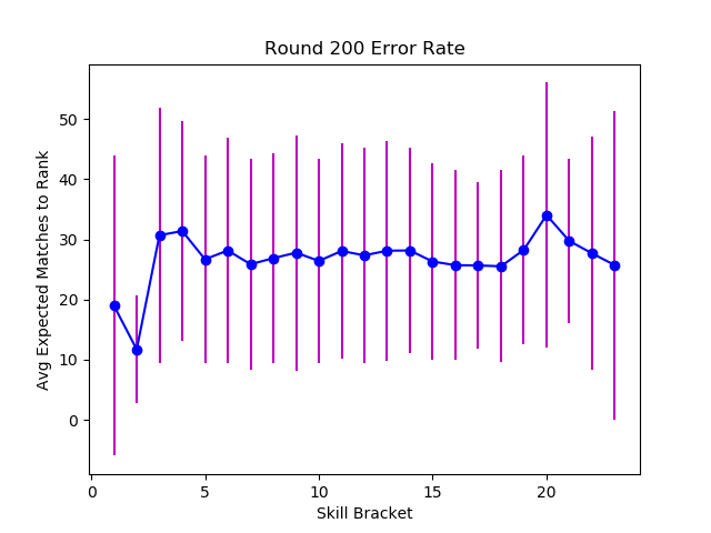 Below we can see that the tournament from before yielded roughly accurate player rankings, with a moderate but persistent margin of error across all skill levels. Even in seperate tests where I expanded the team size to 5 person teams (used in online games like League of Legends and Overwatch), the results were not significantly different. Error margins were moderate and persistent across all skill bands, with the greatest fluctuations at the tails of the distribution where players are sparse.